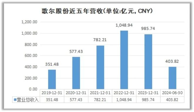 数据显示,2019年-2022年,歌尔股份的营业总收入分别为351.48亿元、577.43亿元、782.21亿元、1048.94亿元,增幅分别为47.99%、64.29%、35.47%、34.10%;2023年势头扭转,只有985.74亿元,同期下降6个百分点——从30%+正增长到负6%,对市场的冲击可以想见。
