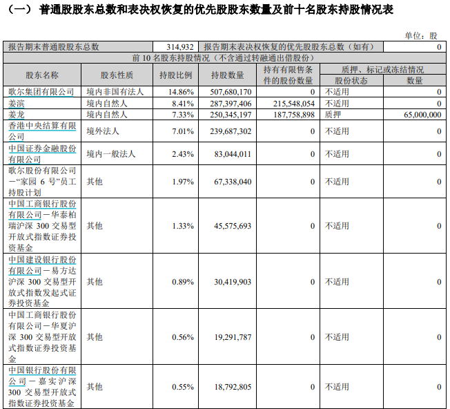股权方面,截至三季度末,歌尔股份持股比例在5%以上的股东共有4家,分别为歌尔集团有限公司、姜滨、姜龙和香港中央结算有限公司(编注:陆股通),持股比例分别为14.86%、8.41%、7.33%、7.01%。
