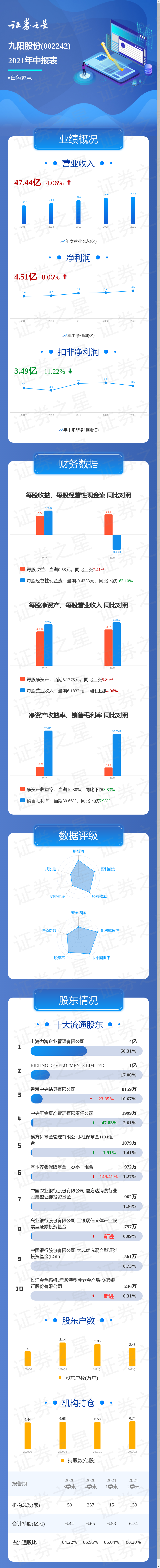 九阳股份2021中报显示,公司主营收入47.44亿元,同比上升4.06%;归母净利润4.51亿元,同比上升8.06%;扣非净利润3.49亿元,同比下降11.22%;负债率50.56%,投资收益4820.75万元,财务费用-985.26万元,毛利率30.66%。