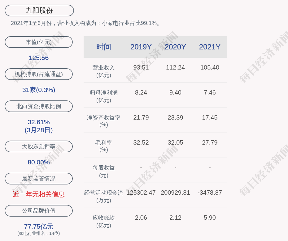 2021年1至6月份,九阳股份的营业收入构成为:小家电行业占比99.1%。