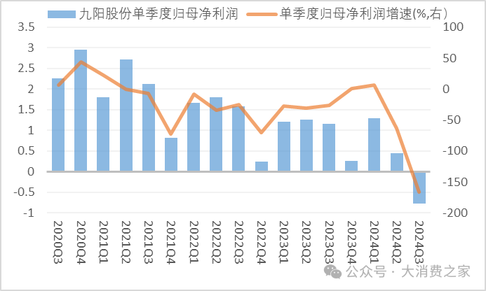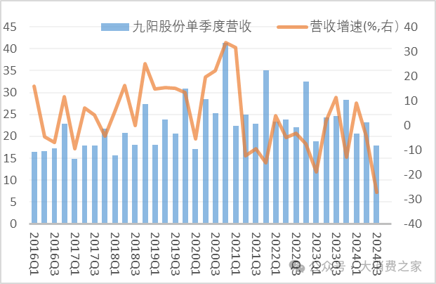 高速吹风机等产品。2024年第三季度九阳股份营业收入17.95亿元,同比下降27%,降幅为2016年以来之最,显示出公司规模发展可能已到了瓶颈期。