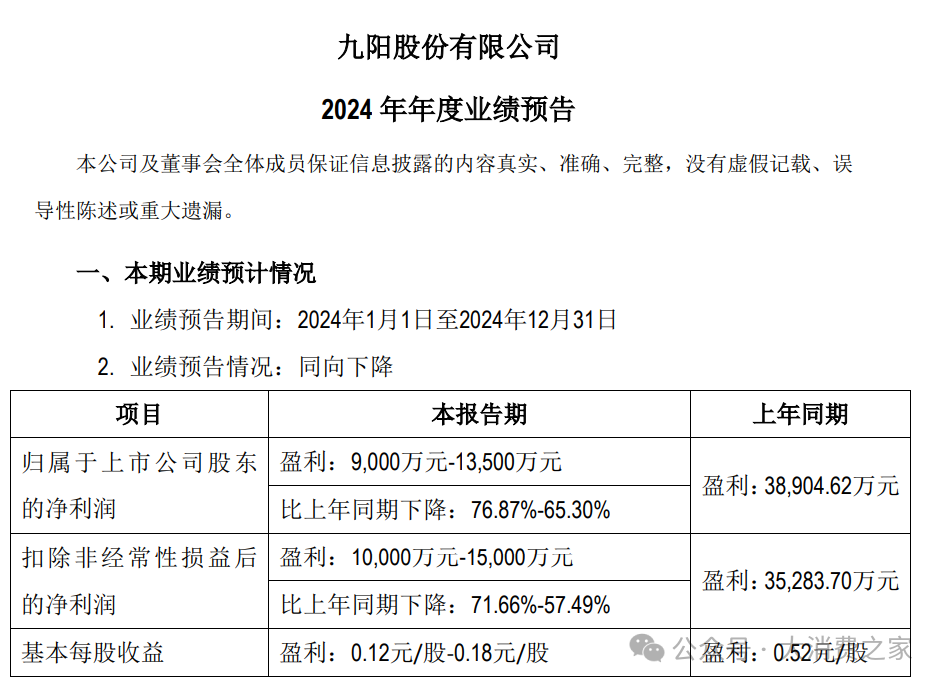 1月22日晚间,九阳股份有限公司(以下简称:九阳)披露2024年业绩预减公告。预计2024年归母净利润为0.9-1.35亿元,同比下降了77%-65%;预计扣非归母净利润为1-1.5亿元,同比下降72%-57%。对应2024年第四季度,归母净利润区间在-0.08至0.37亿元,同比增速为-132%至45%;扣非归母净利润为-0.3至0.2亿元,同比增速-309%至40%。