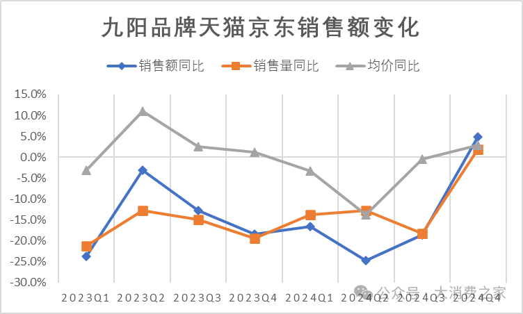 根据久谦中台数据,2024年九阳在天猫和京东平台的销售额约为51.5亿元,同比下降了13.7%,其中销量下降10.4%,均价下滑3.7%,量价齐跌。单季度来看,此前销售额及销量已持续多次负增长,其中2024年第三季度销售额同比为-18.6%,直至2024年第四季度才小幅转正。一方面,豆浆机、破壁机等小家电不在以旧换新政策的“八大品类”之中,只在部分地区参与补贴。另一方面,小家电行业竞争变得更加激烈,新兴品牌入局、白牌泛滥、传统大牌延伸品类,使得小家电价格战愈发激烈,九阳股份的市场份额似乎也受到了挤压。