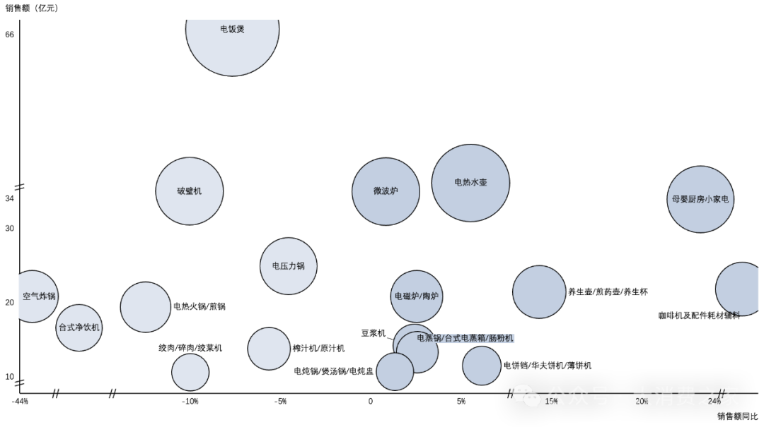 具体到品类,九阳的主流品类破壁机、电饭煲和空气炸锅都出现了爆冷。根据墨镜数据,2024年1月-9月主流电商平台中小型厨房家电的销售额约为508亿元,同比下降3%,其中空气炸锅销售额降幅达40%以上,破壁机降幅10%左右,电饭煲降幅5%以上,九阳的主要品类中只有豆浆机的销售额做到了正增长。