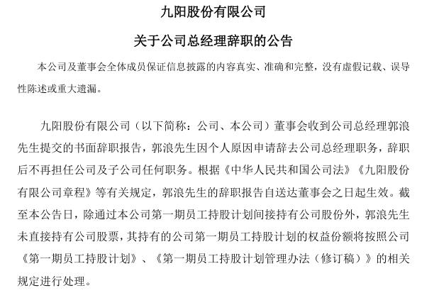 5月8日晚间,九阳股份(002242)发布公告称,公司董事会收到公司总经理郭浪提交的书面辞职报告,郭浪因个人原因申请辞去公司总经理职务,辞职后不再担任公司及子公司任何职务。九阳股份总经理职务暂时由公司财务总监阚建刚代行。