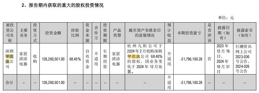 值得注意的是,甲壳虫一直处于亏损状态,在收购不到一年后,九阳股份于2024年10月底宣布将所持甲壳虫全部股权进行转让。此番操作,也导致九阳股份在2024年的投资亏损达3179.62万元。