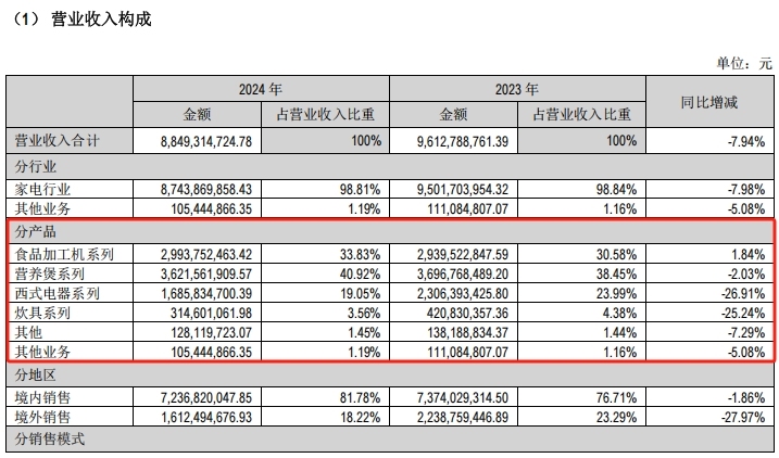 其中,营养煲系列业务2024年营收36.22亿元,同比下降2.03%。西式电器系列和炊具系列的营收同比降幅均超过25%。