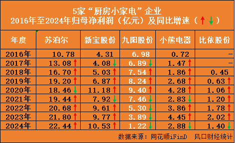 2016年以来统计数据显示,新宝股份的营收规模自2020年始超过九阳股份。2023年以来,小熊电器的归母净利润超过九阳股份;2024年,九阳股份的归母净利润已落后于比依股份。