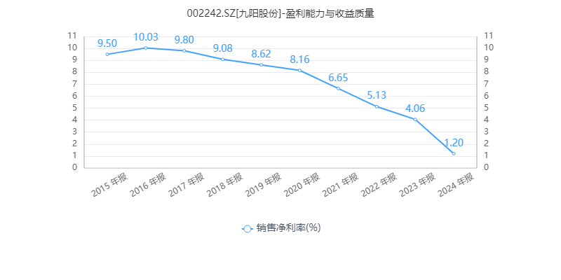 由于竞争导致的降价以及费用成本居高不下等因素,九阳股份的销售净利率由2016年的10.03%降至2024年的1.20%,连续第8年下滑。截至2024年,公司的销售净利率指标在同业中处于落后位置。