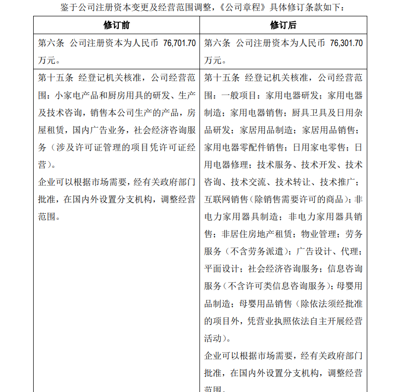 6月23日,九阳股份(002242.SZ)发布公告,宣布董事会全票通过两项重要决议:新增多项经营范围,并注销部分股份缩减注册资本。