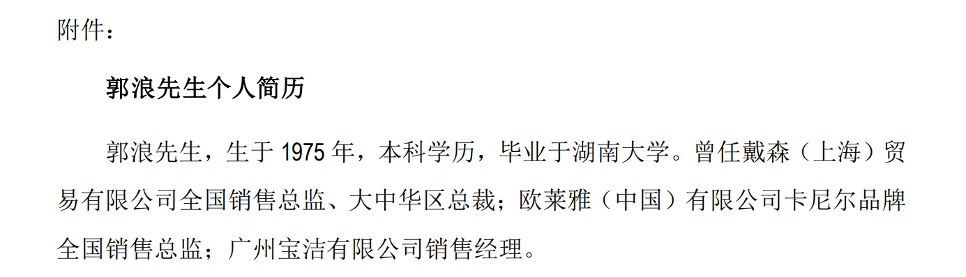 郭浪于2022年12月担任九阳股份总经理,相关履历显示,郭浪曾任戴森全国销售总监、大中华区总裁,以及欧莱雅(中国)有限公司卡尼尔品牌全国销售总监、广州宝洁有限公司销售经理等。