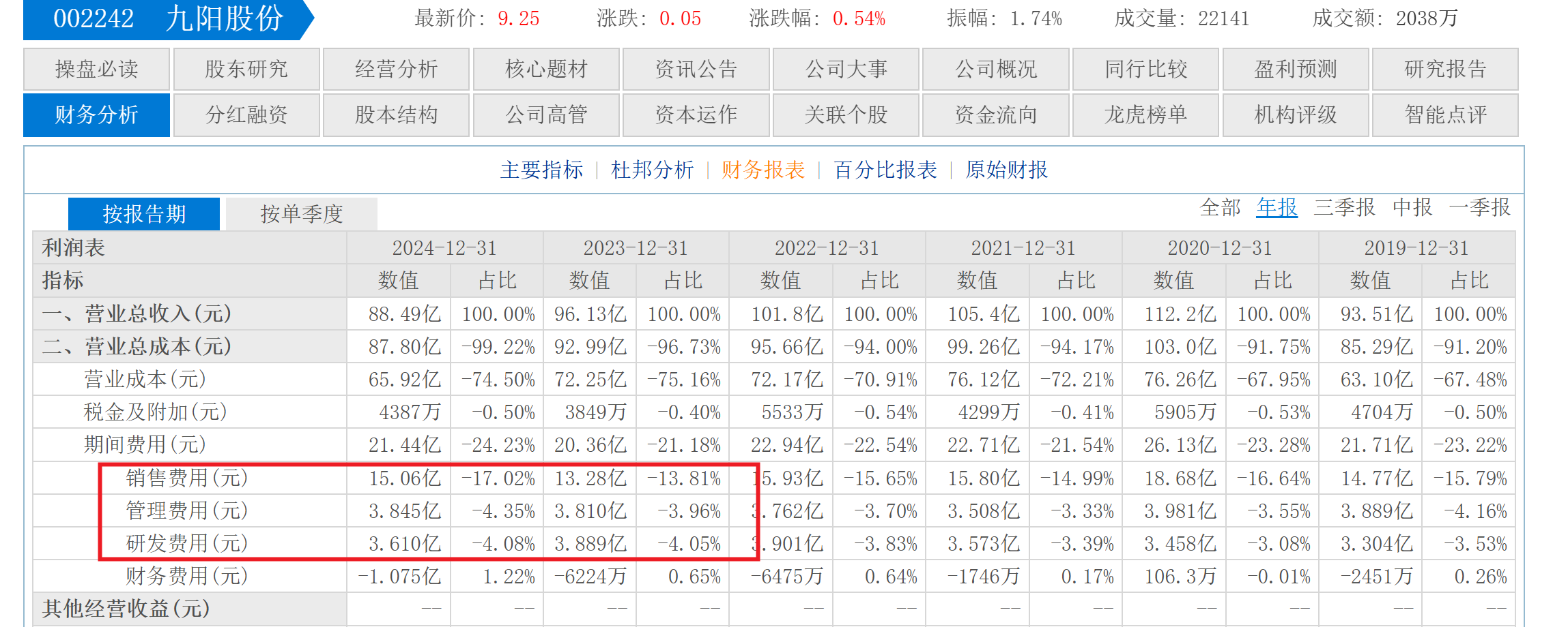 年报显示,2024年,九阳股份的销售费用15.06亿元,同比上涨13.43%,销售费用率17.02%,同比上涨3.21个百分点;管理费用3.85亿元,同比上涨0.92%,管理费用率4.35%,同比上升0.38个百分点;研发费用3.61亿元,同比下降7.19%。