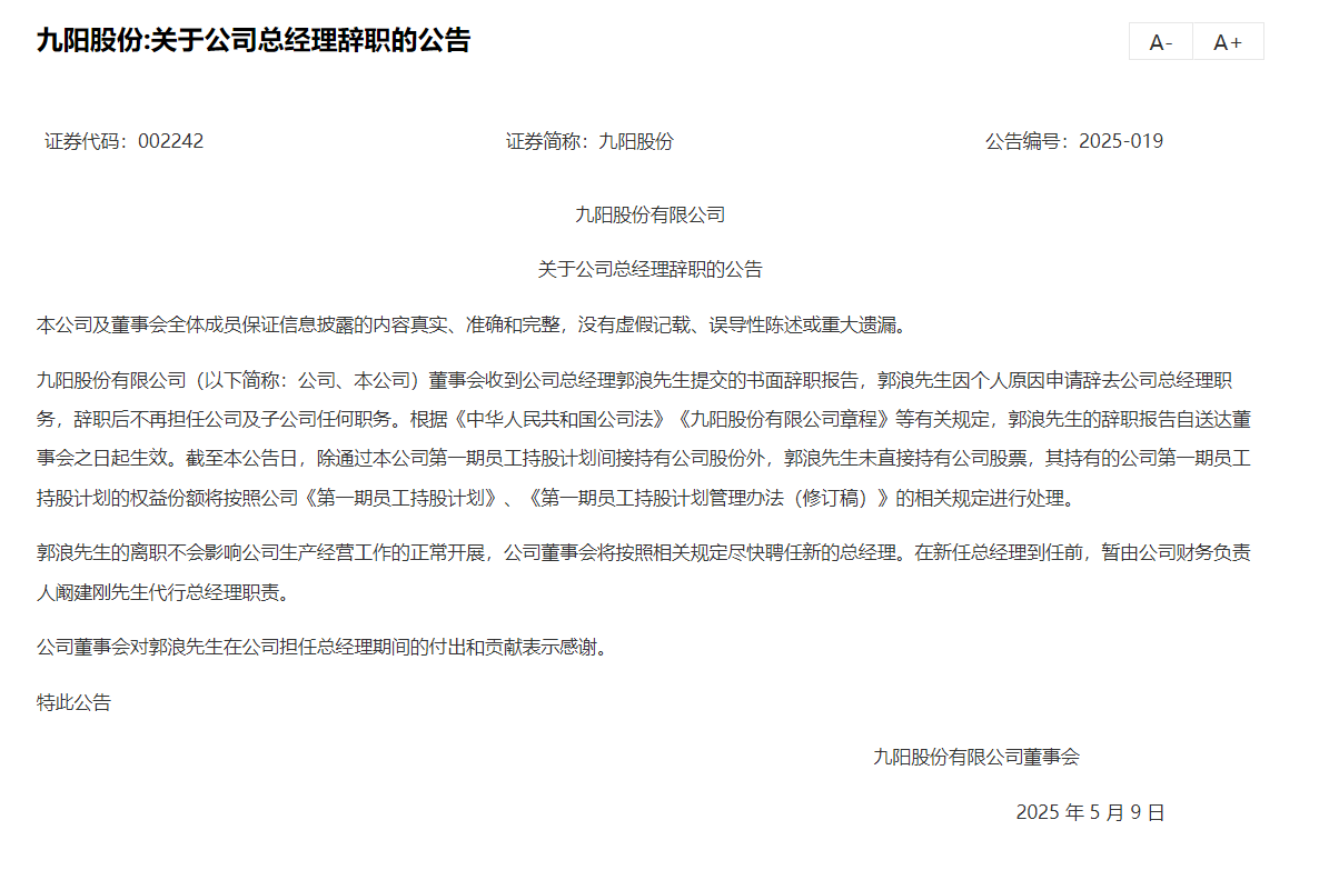 5月9日,九阳股份发布公告称,董事会收到公司总经理郭浪先生提交的书面辞职报告,郭浪先生因个人原因申请辞去公司总经理职务,辞职后不再担任公司及子公司任何职务。公司董事会将按照相关规定尽快聘任新的总经理。在新任总经理到任前,暂由公司财务负责人阚建刚先生代行总经理职责。