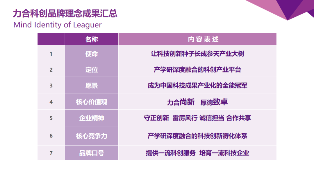 品牌理念部分包含:使命:让科技创新种子长成参天产业大树;定位:产学研深度融合的科创产业平台;愿景:成为中国科技成果产业化的全能冠军;核心价值观:力合尚新、厚德致卓;守正创新、雷厉风行、诚信担当、合作共享;核心竞争力:产学研深度融合的科技创新孵化体系;口号:提供一流科创服务、培育一流科技企业。
