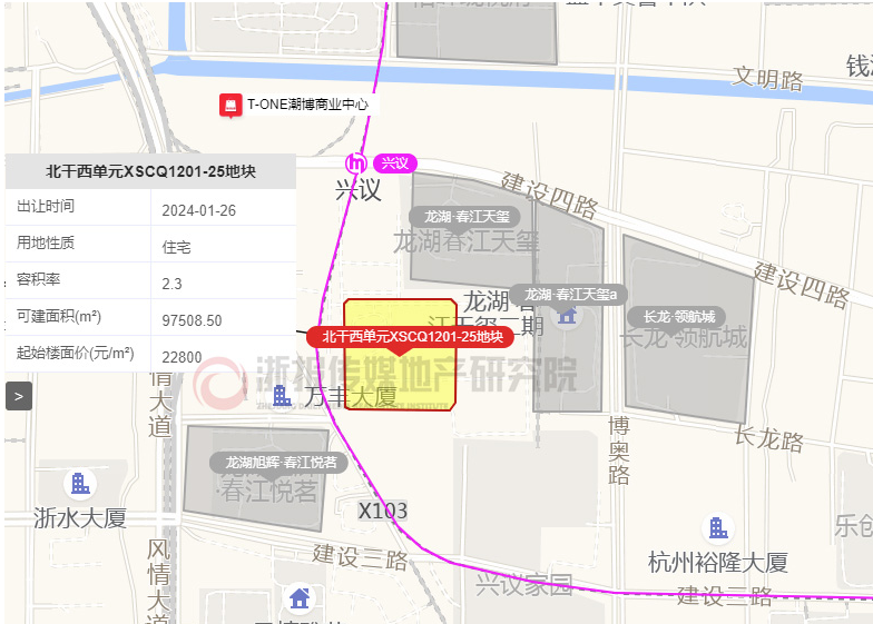 北干西单元XSCQ1201-25地块,由滨江集团以29.0319亿总价竞得,溢价率为30.59%。东至兴议路、南至B5路、西至萧邮路、北至横二路。地块出让面积42395㎡,容积率2.3,建筑面积97509㎡。成交楼面价29774元/平方米,精装限价39500元/㎡。