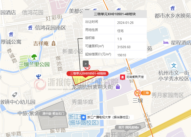 滨江集团斩获的两宗宝地分别位于西湖区三墩板块和萧山区北干板块,均是城中的热门区块。其中三墩单元XH010501-48地块,由滨江集团以7.19亿总价竞得,溢价率为20%。东至紫荆花北路,南至三墩镇H部分地块,西至三墩镇H部分地块,北至三墩街。地块出让面积16584㎡,容积率1.9,建筑面积31510㎡。成交楼面价22818元/平方米,精装限价36800元/㎡。