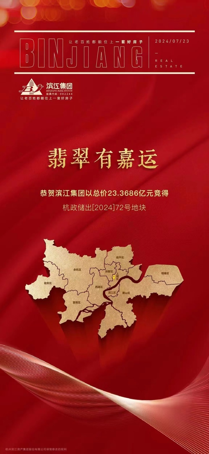 乐居财经张林霞 7月23日,滨江集团23.3686亿元竞得杭政储出[2024]72号上城区城东新城单元SC080201-57地块,溢价率约22.55%。