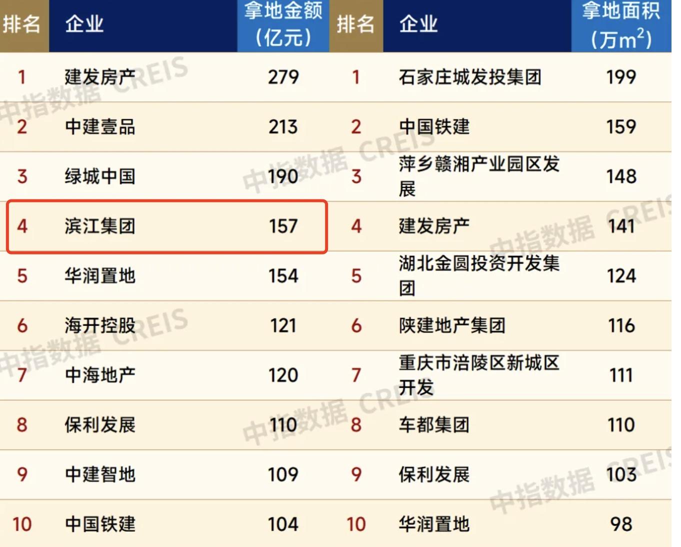 上半年,在别家房企勒紧裤带过日子的时候,滨江没少拿地。报告期内公司新增项目10个,均位于杭州,权益拿地金额112.2亿元,在第三方机构的拿地榜单上能打进前五。