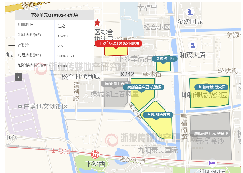 杭政储出[2024]143号(2024钱塘云)地块,由滨江兴耀贝壳联合体以62318万元总价竞得,楼面价16370.18元/平方米,溢价率16.88%。地块位于钱塘区,东至松华路,南至云沙街,西至松合路,北至学源街,地块建筑面积38068平方米,容积率2.5。