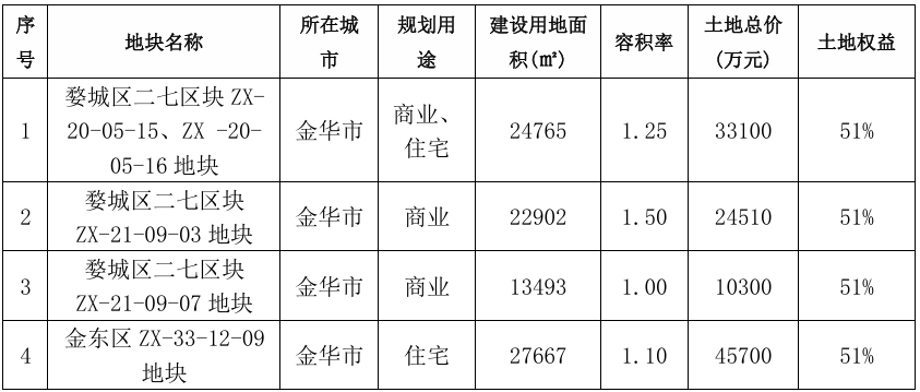 2025年2月10日晚间,滨江集团(002244.SZ)公告新增4块土地储备项目,以增加可持续发展能力。该4块土地全部位于浙江金华。