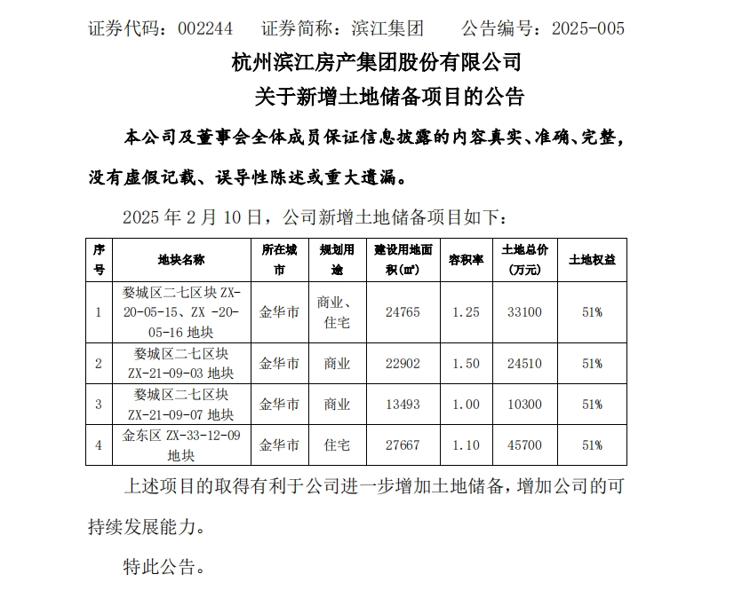 2月11日,滨江集团公告获取金华市金东区ZX-33-12-09等4宗商业及住宅地块各51%股权,这些地块均由金华城投土拍购入。值得注意的是,其中一宗为容积率1.1的低密度住宅地块,两宗为纯商业用地,以及一宗商业、住宅用地。