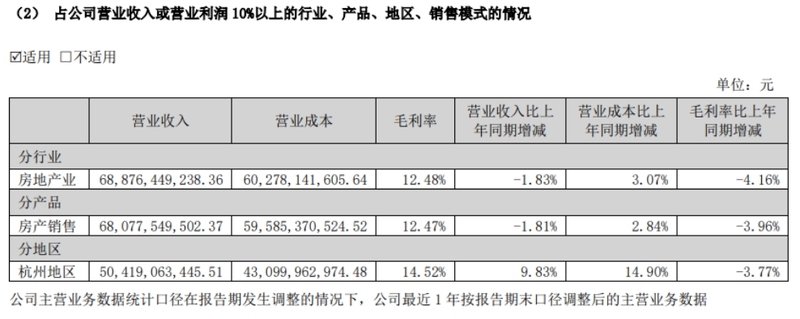 具体来看,2024年,滨江集团房地产业毛利率12.48%,房地产销售毛利率12.47%,同比下降3.96%,杭州地区的毛利率为14.52%,同比下降3.77%。