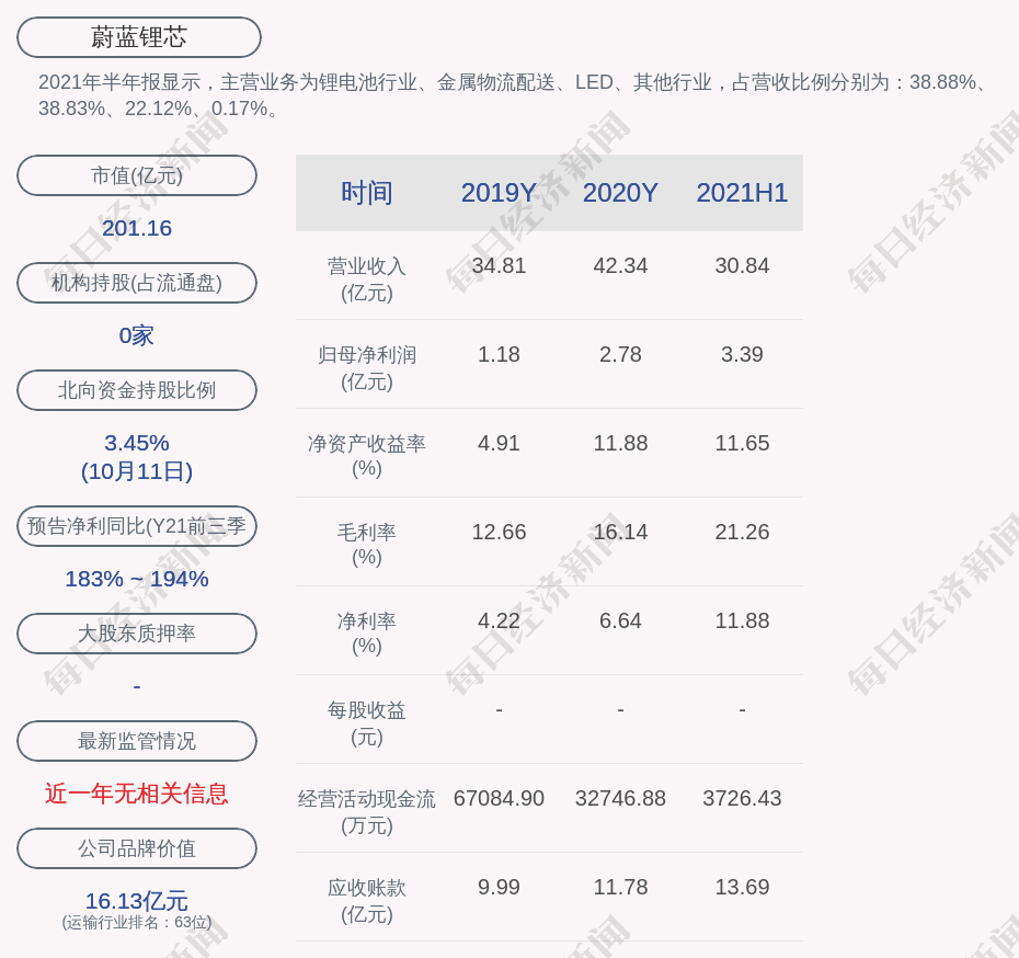 2021年半年报显示,蔚蓝锂芯的主营业务为锂电池行业、金属物流配送、LED、其他行业,占营收比例分别为:38.88%、38.83%、22.12%、0.17%。