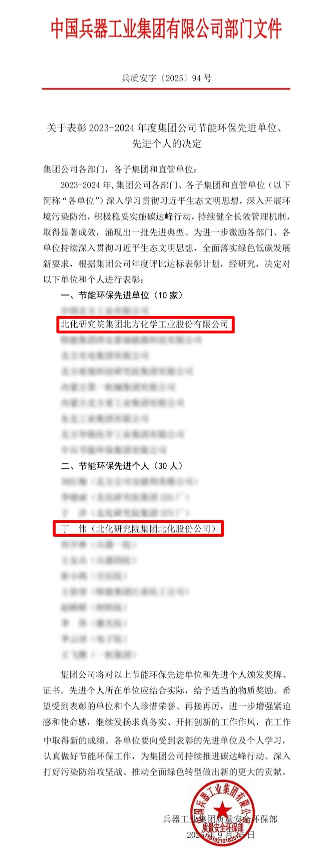 9月15日,中国兵器工业集团有限公司公布了2023-2024年度节能环保先进单位、先进个人表彰名单,我公司被评为“节能环保先进单位”,丁伟同志荣获“节能环保先进个人”称号。