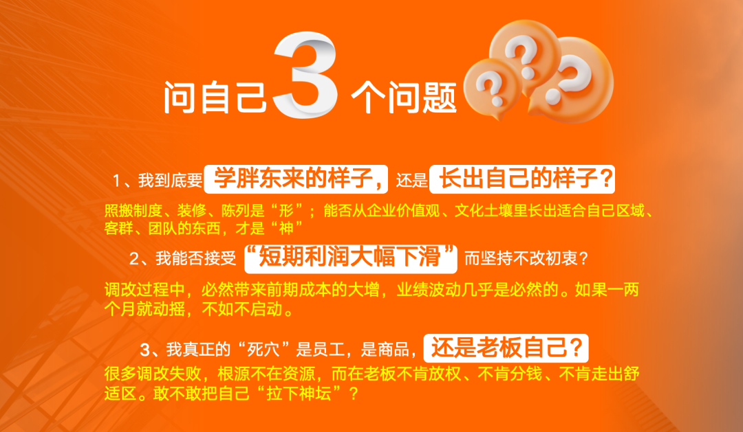 第二问:我能否接受短期内因调改而利润下滑的现实,并且依然守住初心?调改前期,必有投入,成本叠加,但这其实是必经之路,那是在消化历史包袱,关掉不良门店,改造现有门店。这是你必须接纳的过程。