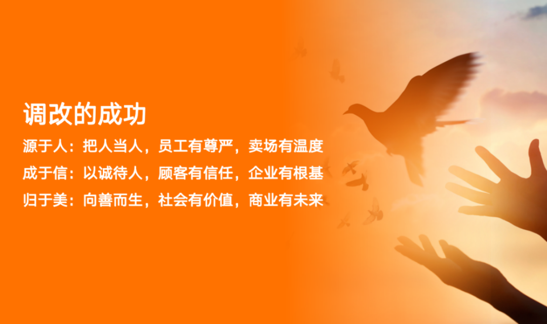 关于调改,我们的人究竟发生了怎样的变化?我们做了什么?这场调改的成功,归根结底是“源于人,成于信,归于美”。源于人,无非是尊重我们的员工,让他们活得有尊严、有价值。