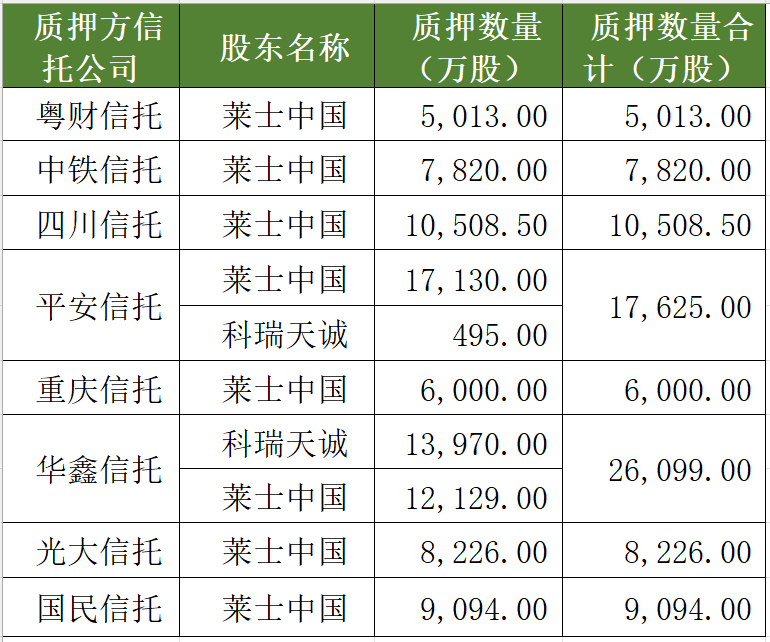 统计数据显示,科瑞天诚和莱士中国未解押股权质押数量分别有8.70亿股、5.37亿股,占其持有的股份数97.91%、97.95%。涉及的信托公司包括粤财信托、中铁信托、四川信托、平安信托、重庆信托、华鑫信托、光大信托、国民信托。其中,华鑫信托未解质押数量最大,两家股东合计质押约2.61亿股。