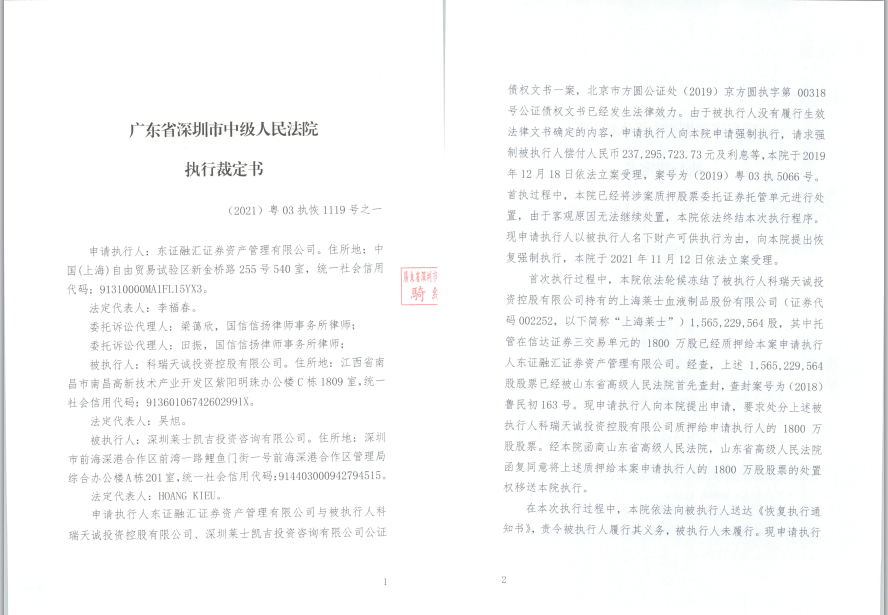 据法拍文件列示的(2021)粤03执恢1119号《执行裁定书》,东证融汇与科瑞天诚、深圳莱士凯吉投资咨询有限公司(简称:莱士凯吉)公证债权文书一案。因被执行人科瑞天诚未偿付2.37亿元及利息,东证融汇向深圳中院申请强制执行,拍卖其质押的“上海莱士”股票1800万股以清偿债务。