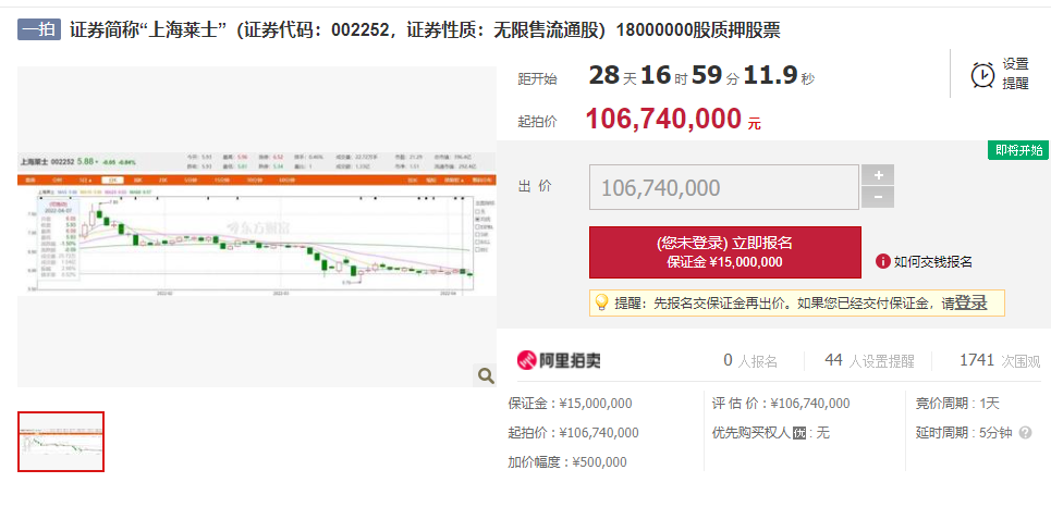 日前,淘宝网司法拍卖网络平台新增一则大额标的,总价为1.07亿元的“上海莱士”(证券代码:002252)1800万股股票。