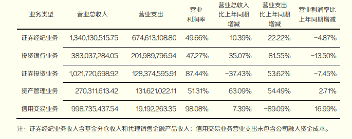 从主要业务条线来看,东北证券证券经纪分部揽收13.40亿元,同比增长10.39%;创利6.66亿元,毛利率为49.66%。证券投资分部揽收10.22亿元,同比下降37.43%;创利8.93亿元,毛利率为87.44%。信用交易分部揽收9.99亿元,同比增长7.39%;创利9.80亿元,毛利率高达98.08%。投资银行分部揽收3.83亿元,同比增长35.07%;创利1.881亿元,毛利率为47.27%。资产管理分部揽收2.70亿元,同比增长63.09%;创利1.39亿元,毛利率为51.31%。