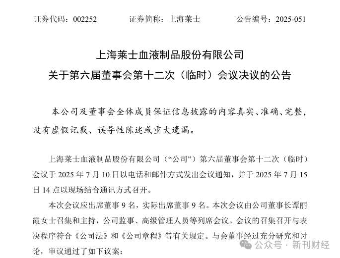 7月16日,上海莱士(002252.SZ)发布公告称,公司第六届董事会第十二次(临时)会议于7月15日顺利召开,会议审议并表决通过了三项议案。然而,董事顾琮祺却在两项关键议案上连续投出反对票,引发市场关注。