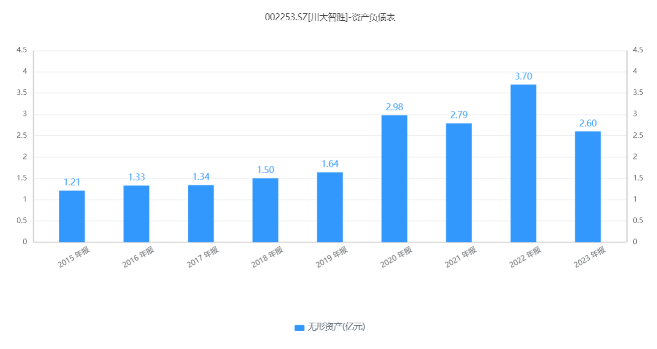 近年来,川大智胜的无形资产出现大幅波动趋势。财务数据显示,2019年-2023年,川大智胜的账面价值分别为1.64亿、2.98亿、2.79亿、3.70亿以及2.60亿,同比增长分别为9.42%、81.91%、-6.48%、32.55%以及-29.73%。