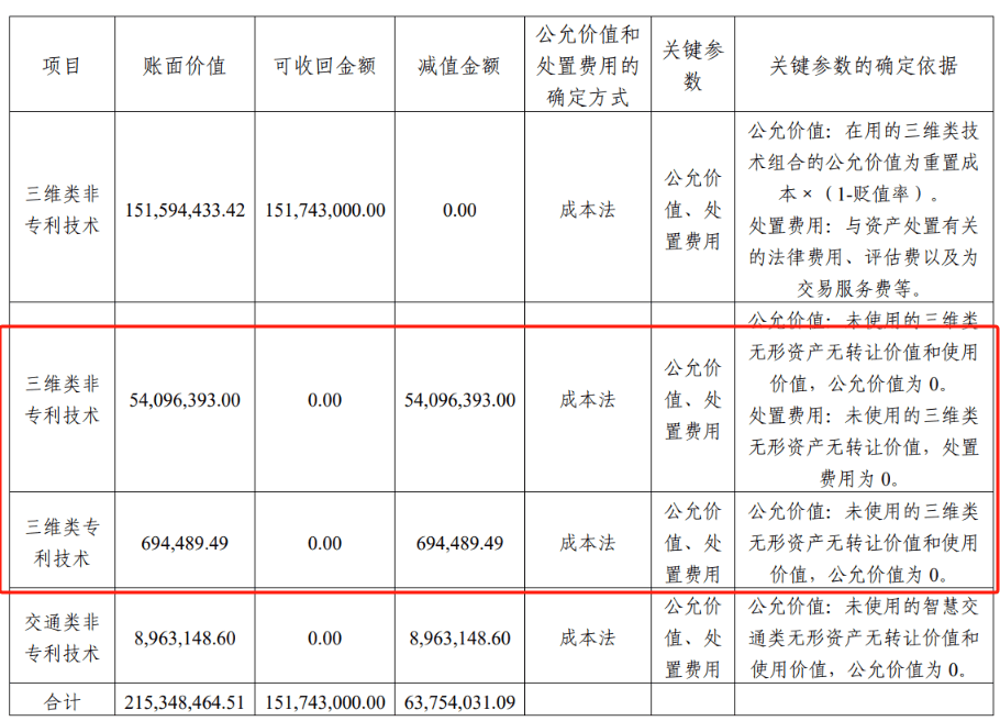 对此,深交所在问询函中指出,上述项目的取得时间、取得方式、入账价值及依据、摊销方法、以前年度摊销情况、减值测试的计算方法、选取的参数及假设等。并结合三维类技术组合的构成内容、组合确认方式、以前年度组合构成及变化情况等,说明你公司认为上述无形资产无转让价值和使用价值的原因,相关减值迹象的发生时间节点及依据。