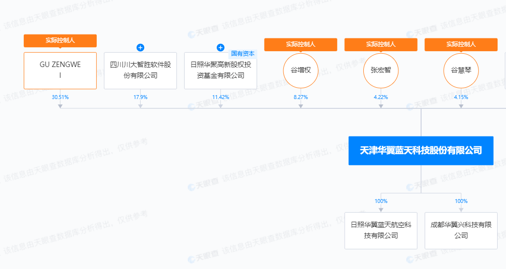 根据天眼查,川大智胜持有华翼蓝天17.90%的股权。华翼蓝天背后的实际控制人为GU ZENGWE、谷增权、张宏智以及谷慧琴。上述四人持有华翼蓝天近50%的股权。
