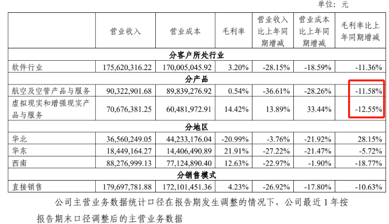 年报显示,川大智胜2023年主要产品航空及空管、虚拟现实和增强现实产品与服务毛利率分别为0.54%、14.42%,分别下降11.58%、12.55%。