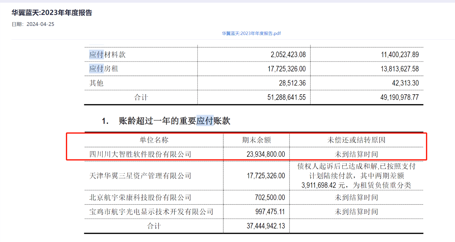 然而,在华翼蓝天的2023年年报上,该笔款项未偿还或结转的原因是“未到结算时间”,并非是川大智胜所述的逾期未支付情况。