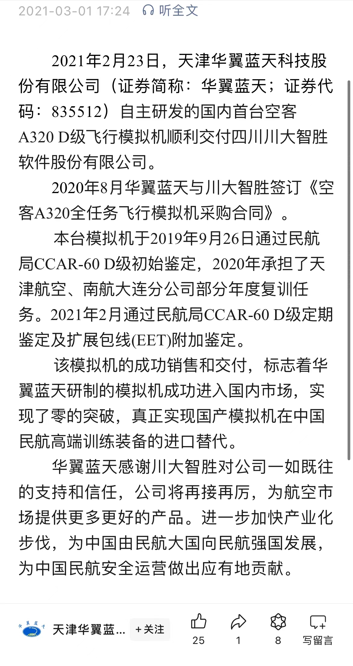 这笔采购合同的签订还意味着川大智胜为华翼蓝天这台A320飞行模拟机实现了订单零的突破。“该模拟机的成功销售和交付,标志着华翼蓝天研制的模拟机成功进入国内市场,实现了零的突破。”华翼蓝天曾在上述公众号文章中表示。
