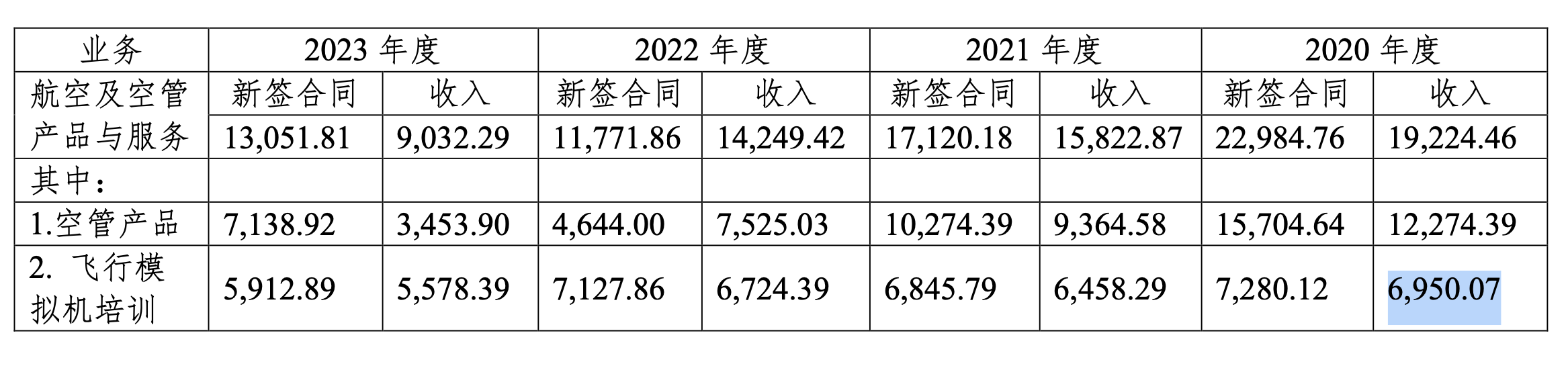 在收入降低的情况下,川大智胜所拥有的4台空客A320飞行模拟机每年的设备资产折旧、人工成本、培训服务费等成本相对固定,这导致其飞行模拟机培训业务的毛利被挤压。2020年—2023年,包括培训业务在内的航空及空管产品与服务业务营收一再下滑,2023年已不足2020年的50%,毛利率更是从42.28%降至0.54%。