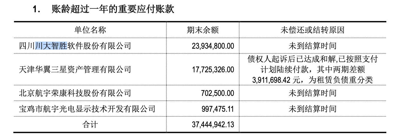 不过,有一个细节需要注意的是,在华翼蓝天2023年年报中,同样一笔2393.48万元对川大智胜的应付款,未偿还的原因却是未到结算时间。如果这是同一笔账款,那为何双方对于其逾期情况说法不一?