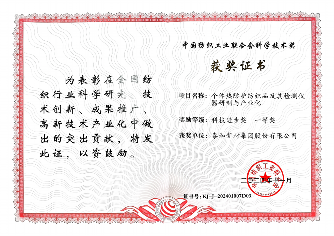 近日,泰和新材参与的“个体热防护纺织品及其检测仪器研制与产业化”项目荣获2024年度中国纺织工业联合会科技进步奖一等奖。