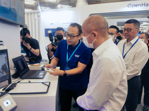 拓维信息旗下开鸿智谷总裁解伟俊为工信部副部长王江平演示产品使用