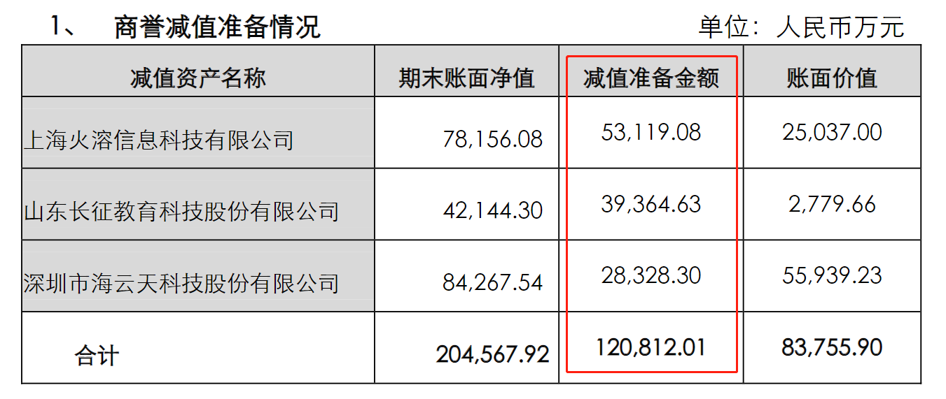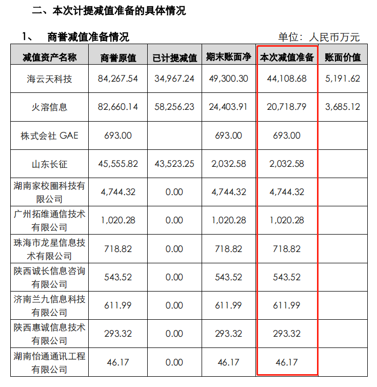 值得一提的是,其中多家子公司已在2018年度进行了大额商誉计提,根据拓维信息2019年2月26日发布的《关于计提资产减值准备的公告》,火溶信息、山东长征、海云天科技分别计提5.31亿元、3.94亿元、2.83亿元,合计12.08亿元,从而导致公司2018年度净亏损13.66亿元。