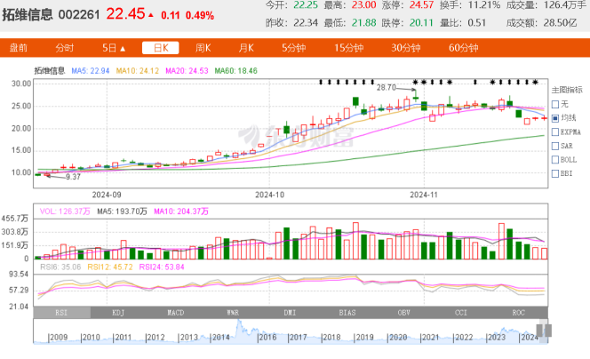 根据2024年三季度财报,拓维信息实现主营收入29.45亿元,同比大幅增长57.26%,但其归母净利润仅为1101.32万元,同比下降84.85%。分析人士指出,市场的“强预期”与“弱现实”之间的落差,使得股价支撑压力加大。