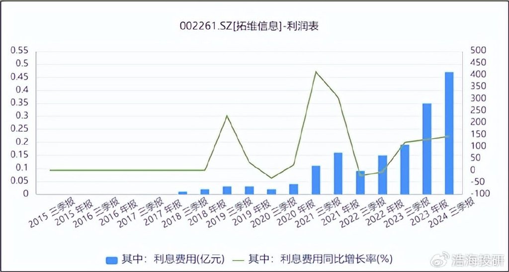 相较于股权融资,债务融资的劣势就是利息。伴随债务资本的增加,拓维的利息费用也是陡峭增长。2024年前三季度,拓维的利息费用发生额为0.47亿元,同比增速高达143.5%。