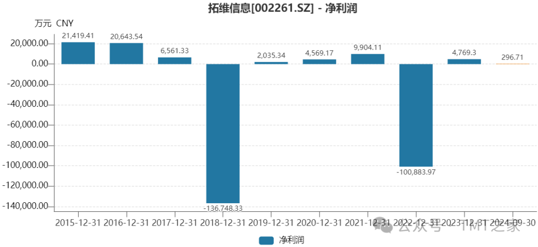 尤为值得一提的是,拓维信息盈利能力一直较为薄弱,从2015年以来基本保持在2.5亿元以内,且每隔三年便会出现一次超过10亿元的亏损。