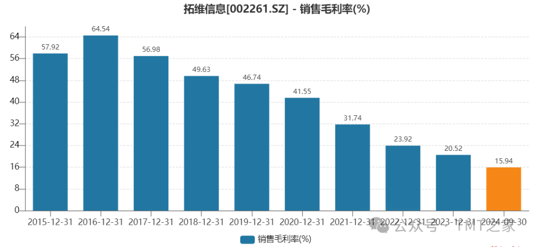 尽管拓维信息在“鲲鹏、昇腾AI、开源鸿蒙、云”四大核心领域展开了深度合作,共同推动国产计算产业的发展。然而,如今看来,这种合作似乎并没有带来公司竞争力的明显提升。近年来,拓维信息的毛利率持续下滑,从2016年底的64.54%降至2023年的20.52%,2024年前三季度更是进一步跌至15.94%。一方面,虽然拓维信息在国产智能计算、开源鸿蒙以及人工智能等领域确立了自身的竞争优势,但面对激烈的市场竞争,公司的盈利能力却大幅下滑;另一方面,拓维信息在产业链上下游的议价能力并不算高,这也在一定程度上限制了其利润空间的提升。